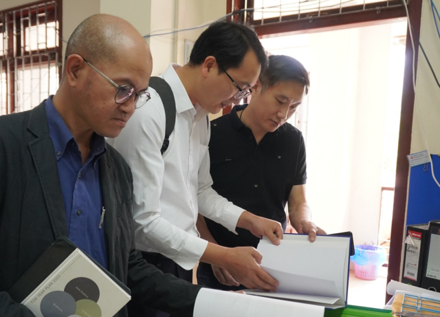 会后,双方教师共同走访了老挝国立大学建筑学、城乡规划、建筑技术和装饰设计等4个专业教研室,详细了解团队建设规划、团队队伍结构及科研教学情况。走访过程中,我方教师还特别关注了员工的日常学习场景,在教室、员工工作室与建筑学专业员工亲切交谈,观看员工的建筑设计竞赛、装饰设计作品等。