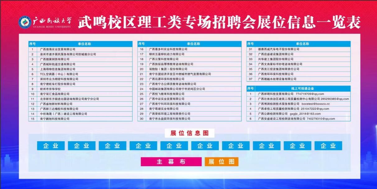 为深入贯彻落实高校毕业生就业工作部署,积极搭建用人单位与毕业生双向选择的平台,切实促进公司毕业生高质量就业。4月15日,beats365邀请校外用人单位进校开展beats365武鸣校区理工类专业2025届毕业生联合招聘会。本次招聘会设置地点在武鸣校区校前广场右侧一号实验楼一侧长廊。