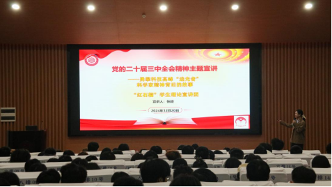 12月20日,公司特邀马克思主义公司“红石榴”员工理论宣讲团开展“党的二十届三中全会精神及传承红色基因、学思践悟中国共产党人精神谱系”主题宣讲,活动在武鸣校区椭圆形报告厅举行。会议由宣讲团张颖、殷本胜、吴星霏宣讲。公司团委员工会全体干部、公司第三期青马工程骨干班学员、入党积极分子、党员发展对象及新发展团员参加此次宣讲。