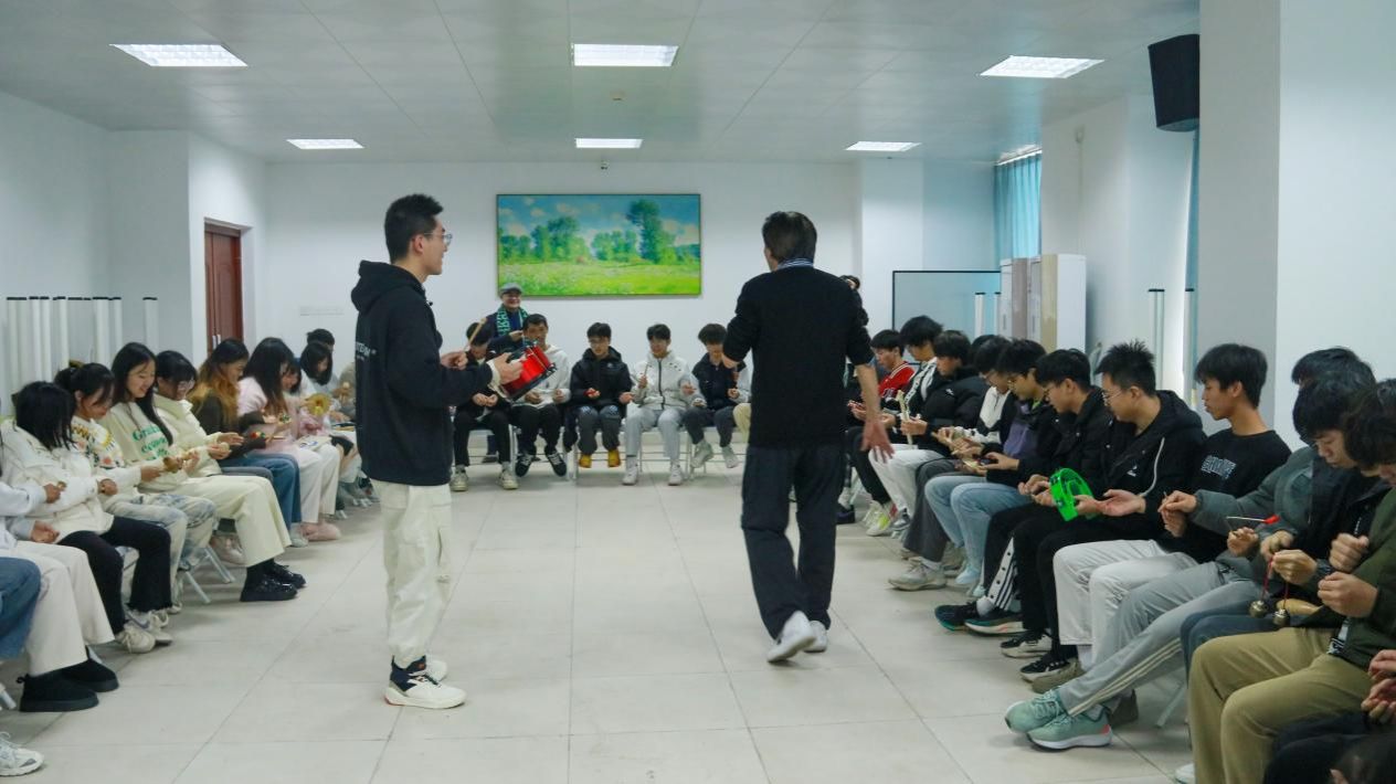 活动现场,邹坚先是深入浅出地讲解了音乐治疗的原理及对心理减压的积极作用,让同学们对其有初步认识,借助音乐的节奏、旋律等元素,帮助大家调节呼吸频率、放松肌肉紧张度,实现身心状态从应激向放松的有效转换。在李凯与吴颖婕的带领下,同学们围成一圈,通过“击鼓传乐器”、“裹丝巾跳舞”营造刺激欢快的氛围,让同学们脱离紧张感,释放自我。最后,同学们进行大合唱,曲名为《夜空中最亮的心》,由黄乐指挥。不少同学表示感觉身心的压力得到了有效舒缓,整个人更加轻松愉悦。